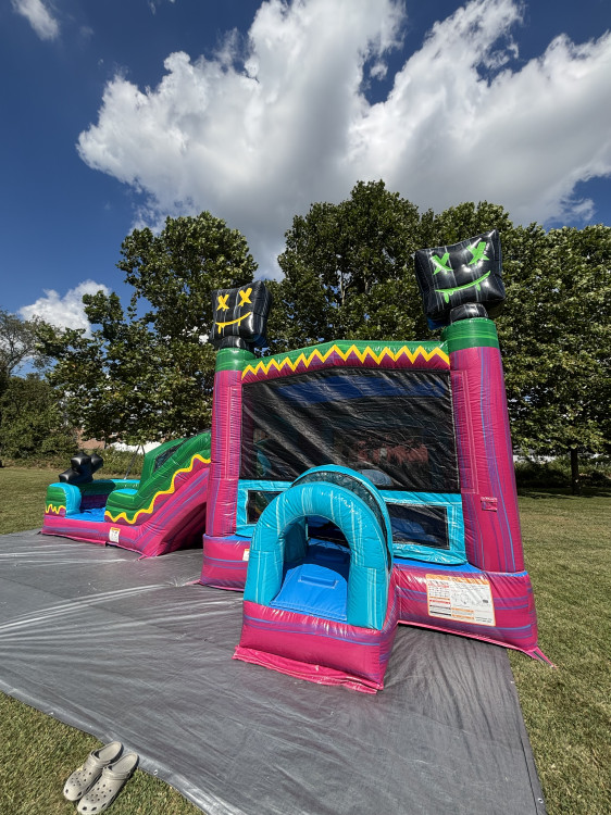 | Why book THIS unit? | Gamer-themed bounce house with neon colors, "X" smileys on the towers, and a dual-lane slide. |