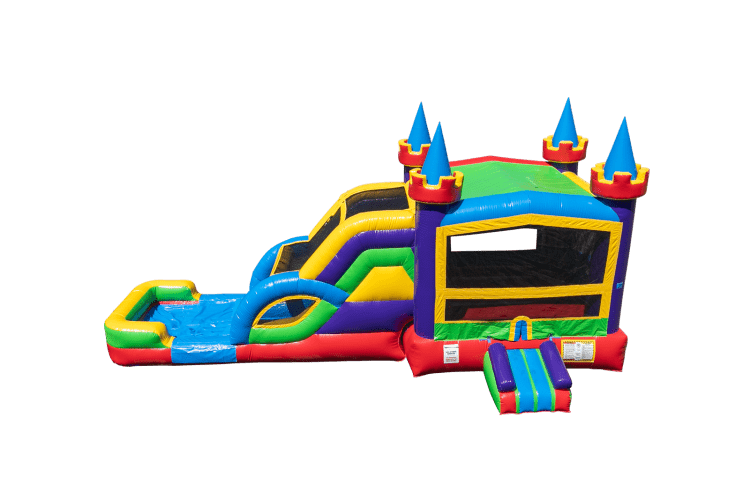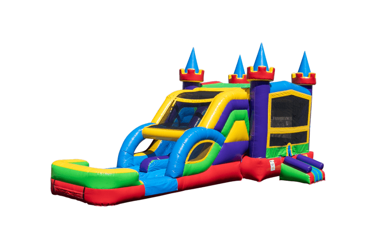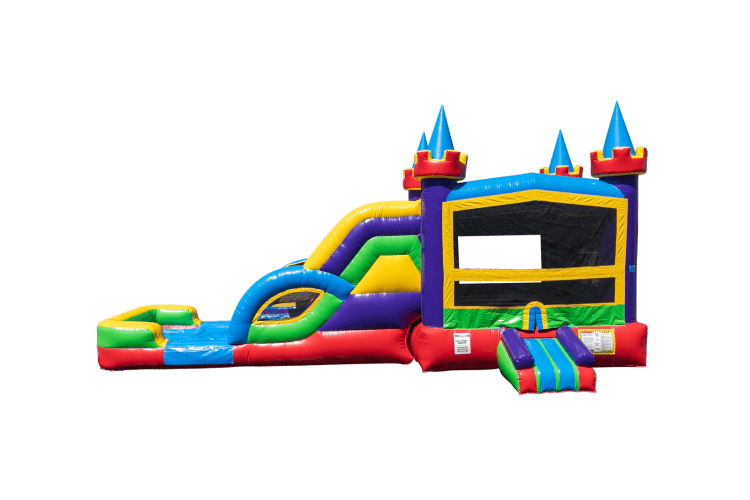 Make your event unforgettable with the LUCKY MODULE DUAL LANE LARGE COMBO——a vibrant inflatable featuring a bounce house, a basketball hoop, dual wet/dry slides and a splash pool.