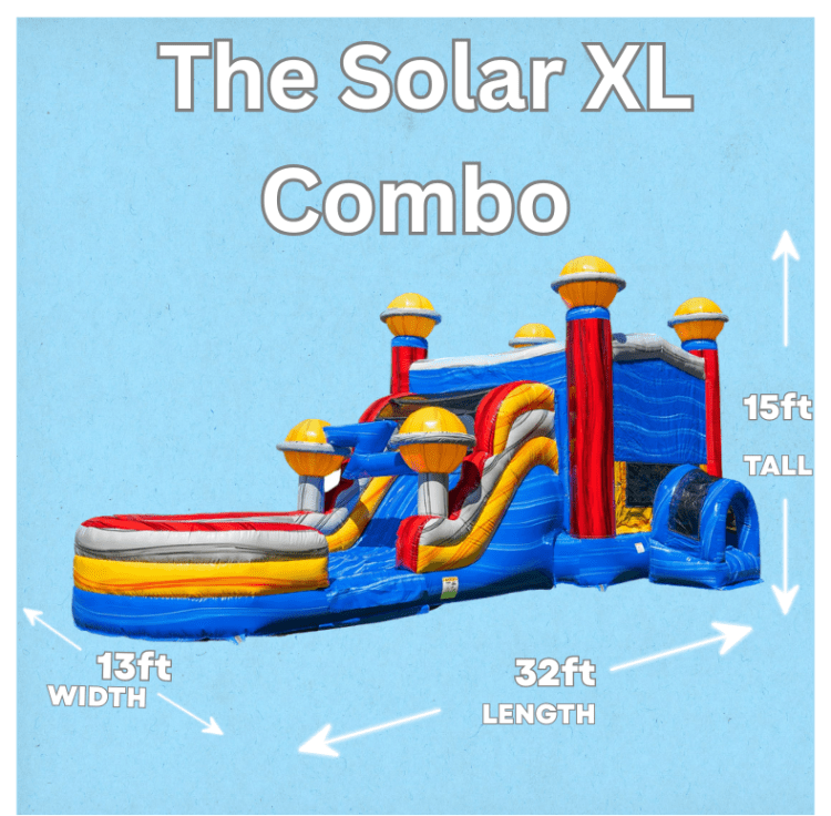 Make your event unforgettable with the Solar Combo——a vibrant inflatable featuring a bounce house, a basketball hoop, dual wet/dry slides and a splash pool.