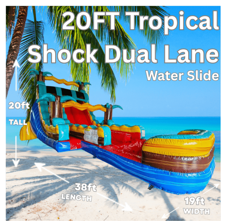 Make your event unforgettable with the 20FT TROPIC SHOCK DUAL LANE WATER SLIDE—-perfect for all events!