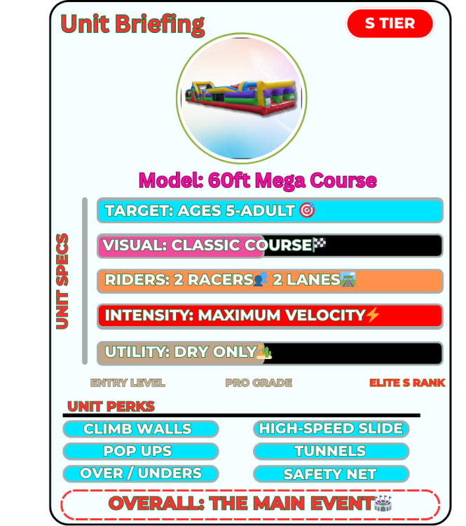 | Why book THIS unit? | An incredible, extra-long challenge course featuring massive tunnels, climbing walls, and multi-colored racing lanes for ultimate competition. |